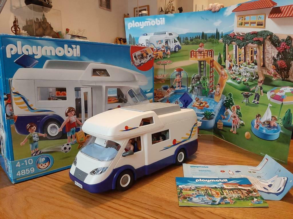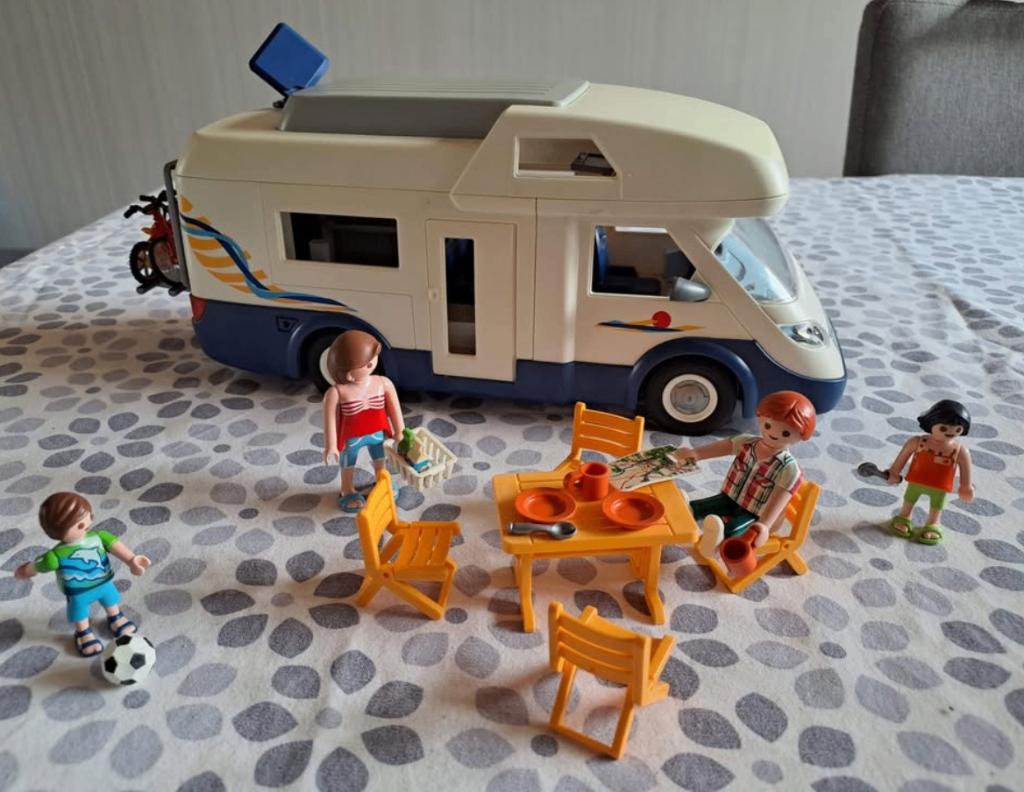 20 feb 26KoenRijkevorsel - Playmobil 4859 grote kampeerwagen, mobilhomePlaymobil kampeerwagen, mobilhome volledig ingericht met badkamer met douche, toilet, wastafel, kookvuur, tafel, 2 slaapplekken, zitplaatsen, 4 personen buitentafel, 4 stoelen, 2 fietsen die op het fiOphalen of Verzenden