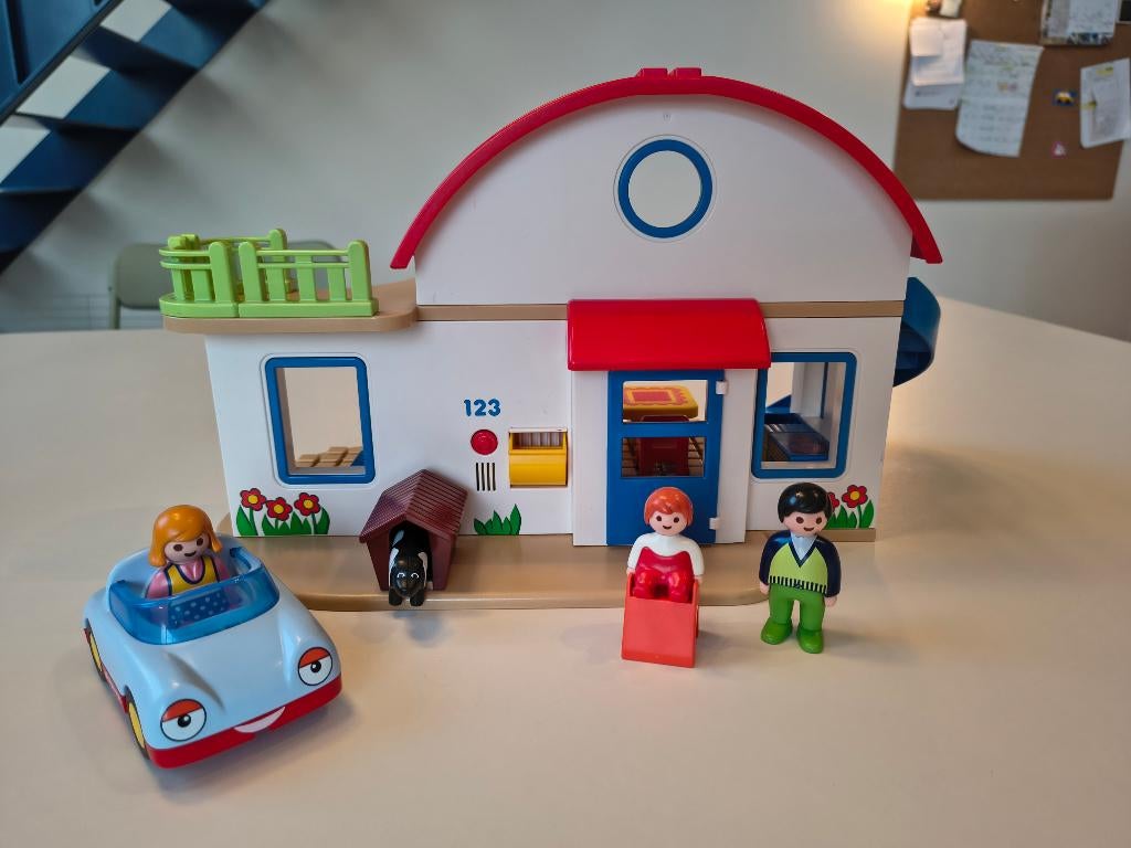 - Playmobil 123 huisHeel mooi huisje, goed voor vele uren speelplezier! Het huisje heeft zelfs een bel (rode knop, werkt nog). In uitstekende staat. Gezin en inboedel is compleet. Enkel doos is er niet meer.Zo goed als nieuw Ophalen