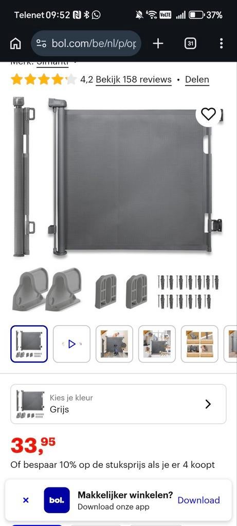 17 jan 26Ruysschaert NMoen - trap- of deurhekje tot 130 cm br-uiterst veilig hekje -kan tot 130 cm overbruggen -oprolsysteem (zijlings) -gebruiksvriendelijk en plaats besparend -vast te maken tussen 2 punten ; niet zomaar verplaatsbaar -bij voorkeur ophalen (zeZo goed als nieuw Ophalen of Verzenden