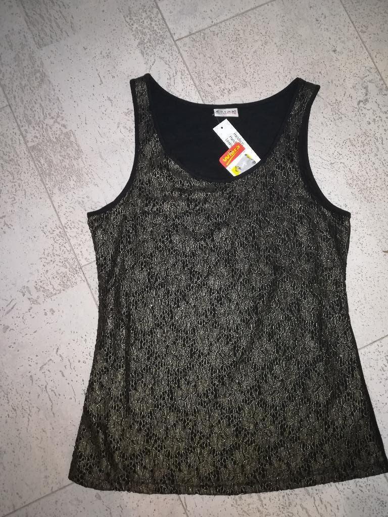 - Elegant Black & Gold Lace Sleeveless Top/ size LChic and timeless sleeveless top made from delicate black lace with a subtle gold shimmer. Perfect for evenings out, special occasions, or dressing up a casual outfit. Color: black with gold metallicOphalen of Verzenden
