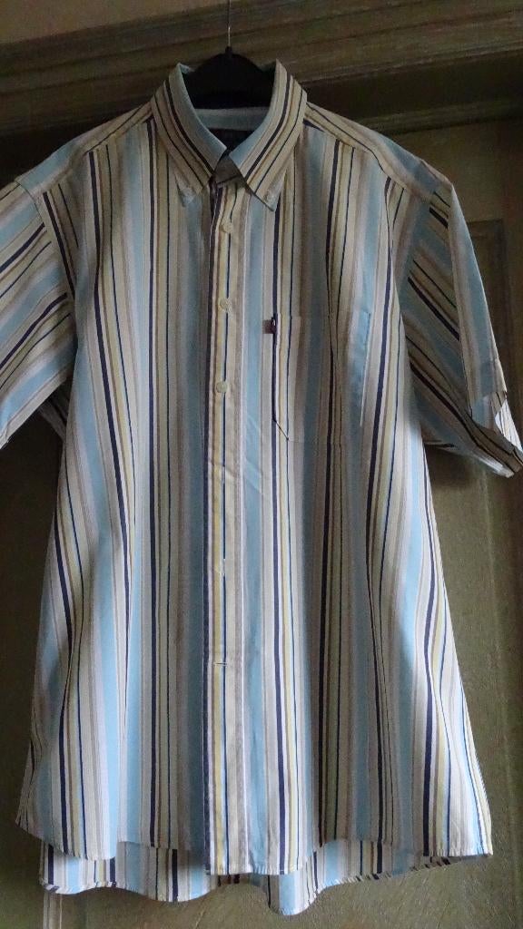 7 apr 26MathiWhisperParike - HEMD ARROW KORTE MOUW XXLMaat xxl korte mouw gestreept donkerblauw/beige/turquoise hals : 44cm, kraag met knoopjes 1 borstzakje lengte : 80cm, oksel : 63cm mouwlengte : 27cm rugplooi 100%katoen perfekte staatGedragen Ophalen of Verzenden