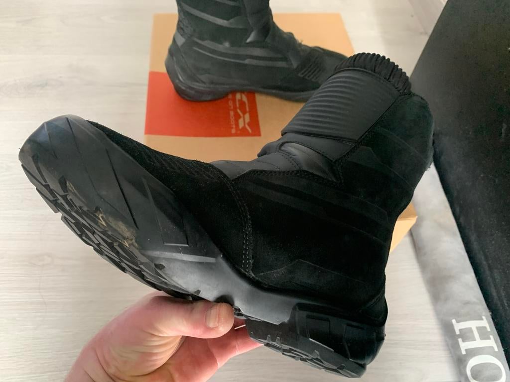 - Moto botten heren TCX - maat 42Moto botten tcx maat 42. Zwart amper gedragen zie foto linker bot, rubber oppervlakkig beschadigd hoogte 34cmTweedehands Ophalen of Verzenden