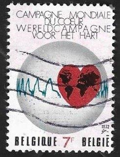 - 1 Postzegel België 1972 Wereldcampagne voor het HartJaar 1972 maand 03 nominale waarde 7 gezondheidszorg, wereldbol allegorie met hart en cardiogram ontwerper/graveur grunhard, salmon, malvaux, jeanGestempeld Ophalen of Verzenden