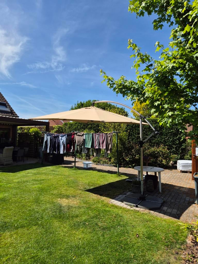 - Overhangparasol 33 m met zware voet 4 stenenOverhangparasol 3x3 meter. Draaibaar, kleur ecru, volledig in orde. Met zware voet, 4stenen. Inclusief nieuwe hoes. Wordt vekocht wegens aankoop terrasoverkapping. Gebruikt, maar in goede staat. EnkrlGebruikt Ophalen