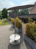 Deze als nieuw zijnde design parasol mag weg wegens dubbel gebruik. Met stevige voet, in hoogte regelbare tafel zodat het ook als staan-tafel met parasol gebruikt kan worden. Parasol draaibaar en in hoek regelbaar. Aangekocht bij gervi outdoor.