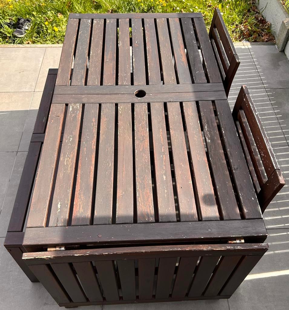 VandaagLeonieAalst - Tuinset: 1 tafel, 2 stoelen en 1 zitbankVolledig samenhorende tuinset: tafel standaard: 1,40 m lengte op 0,76m breedte. Tafel is verlengbaar met 2 zijstukken van elk 0,60m dus naar een lengte van 2,00m of zelfs 2,60m. Over de lengte van 1,4Gebruikt Ophalen