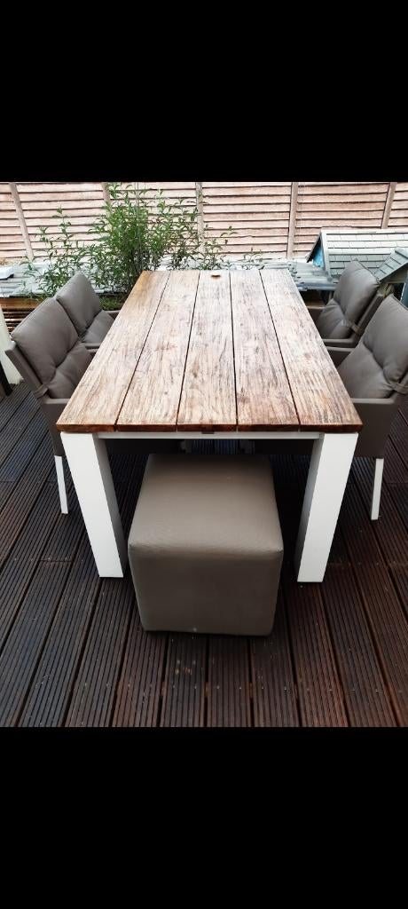 - TuinsetDeze set bestaat uit een tafel, vier stoelen en een poef. De tafel is 180cm lang, 92cm breed en 77cm hoog. De tafel heeft een houten blad en witte poten. De stoelen en poef zijn grijs en waterbestendiGebruikt Ophalen