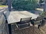 24 mrt 26hennyLieshout bij Eindhoven, NL - Val-Eur teak tafel met 6 Barlow Tyrie textyleen stoelenMooi formaat vierkante tafel van val-eur, 165x165 cm, 74 cm hoog super stevig zwart gepoedercoat stalen onderstel, onverslijtbaar en zeer stabiel val-eur gebruikt altijd top kwaliteit teak hout, ook hGebruikt Ophalen