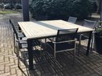 - Val-Eur teak tafel met 6 Barlow Tyrie textyleen stoelenMooi formaat vierkante tafel van val-eur, 165x165 cm, 74 cm hoog super stevig zwart gepoedercoat stalen onderstel, onverslijtbaar en zeer stabiel val-eur gebruikt altijd top kwaliteit teak hout, ook hGebruikt Ophalen