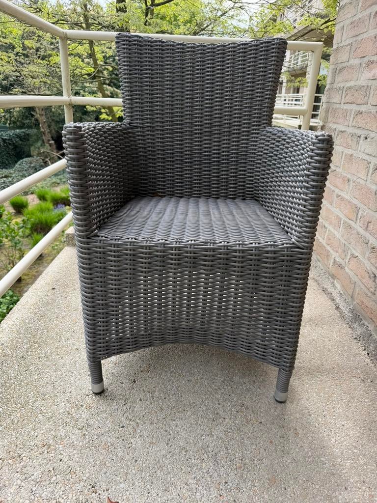 EergisterenKathleenHeist - Grijze tuinstoel van Wicker met kussens (4 stuks)Een grijze tuinstoel met armleuningen. De stoel is gemaakt van wicker en heeft een geweven patroon. De stoel staat op vier poten met zilverkleurige doppen.Zo goed als nieuw Ophalen