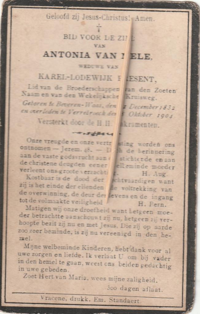GisterencarwillOostende Zandvoorde +Oostende2 bidprentjes " Draad van Dadizele "Ophalen of Verzenden Bidprentje2 bidprentjes " draad van dadizele" --- ik kan er geen datum op plakken, maar bijna zeker toch enkele tientallen jaren oud --- verzendingskosten volgens reële kosten bpost (volume-aankoop) plus 0,15 euro per verzending -- gezamenlijk verzen...Oostende Zandvoorde +OostendeGisteren - Canadees bidprentje van Camille CnockaertBidprentje uit canada van west-vlamingf camille cnockaert geboren in moorslede den 5 maart 1859 overleden in st-boniface (canada) den 10 januari 1932 bidprentje in mooie staatOphalen of Verzenden