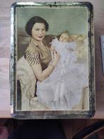 VandaagMaesGeel - Blikken doos vintage royaltyKoektrommel / blikken doos met scharnier op korte kant. Vermoedelijk uit 1954, fabrikant van melle afm. Ca. 18X25x9 cm. Afb. Joséphine-charlotte, groothertogin van luxemburg, met dochter prinses marieGebruikt Ophalen of Verzenden
