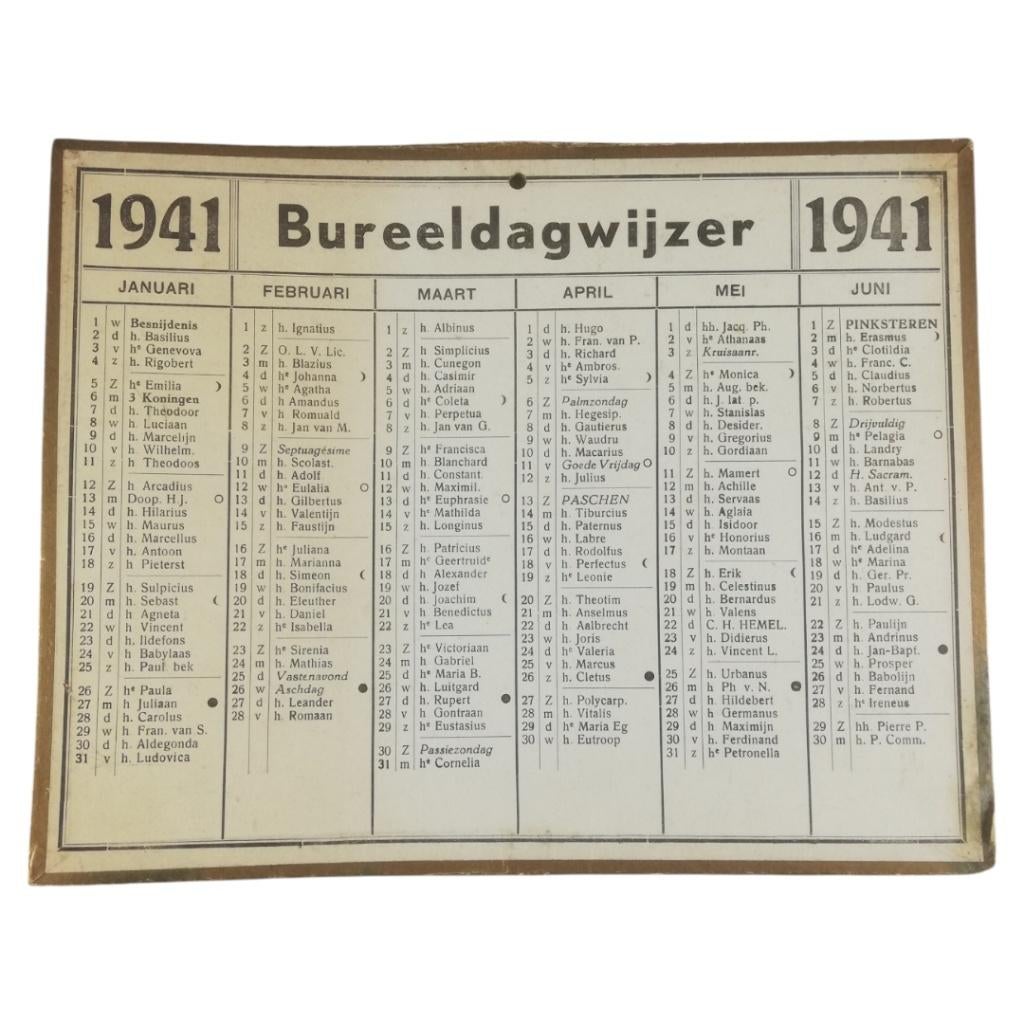 - Bureeldagwijzer - 1941Kalender op karton van het jaar 1941. Ideaal voor een diorama. Afmetingen: 27,5 cm x 21,7 cm. Leveringsinformatie af te halen in onze winkel 'militaria belgium' te alveringem of verzending viaOphalen of Verzenden