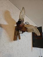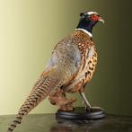 Een opgezette fazant heeft een prachtig verenkleed met kleurrijke, glanzende veren die variëren van bruin tot groen en goud. De staart is lang en kan indrukwekkend zijn, waardoor het een opvallend decoratief stuk is. De grootte kan verschillen afhankelijk van de soort, maar over het algemeen zijn ze redelijk groot en hebben ze een elegante uitstraling.