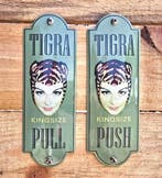 25 dec 25AVDiepenbeek - Tigra king size emaillen reclame bord en deurpostjesTigra king size emaillen sigaretten meisje mooi emaillen reclame decoratie bord zwaar geëmailleerd verschillende lagen gebakken emaille mooie volle kleuren en glans voorzien van oortjes afmetingen 30Zo goed als nieuw Ophalen