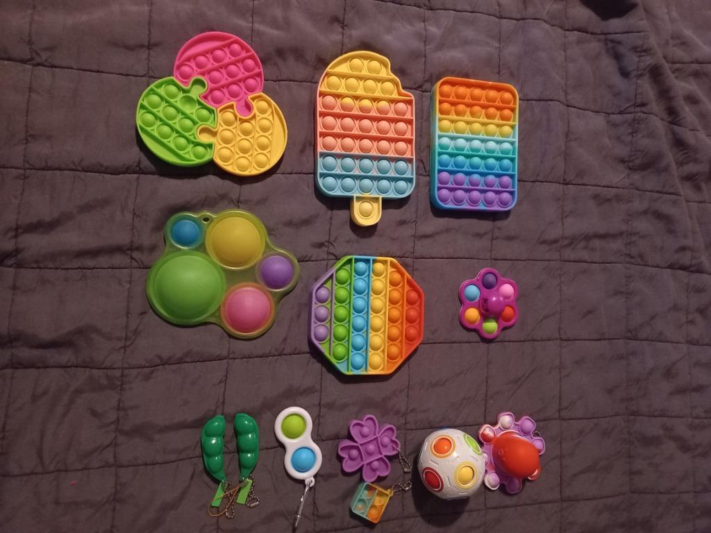 - Fidget toys oa pop itVerschillende fidget toys grootste pop its : 2 euro per stuk (ook bal) kleinere fidget toys : 1 euro per stukZo goed als nieuw Ophalen