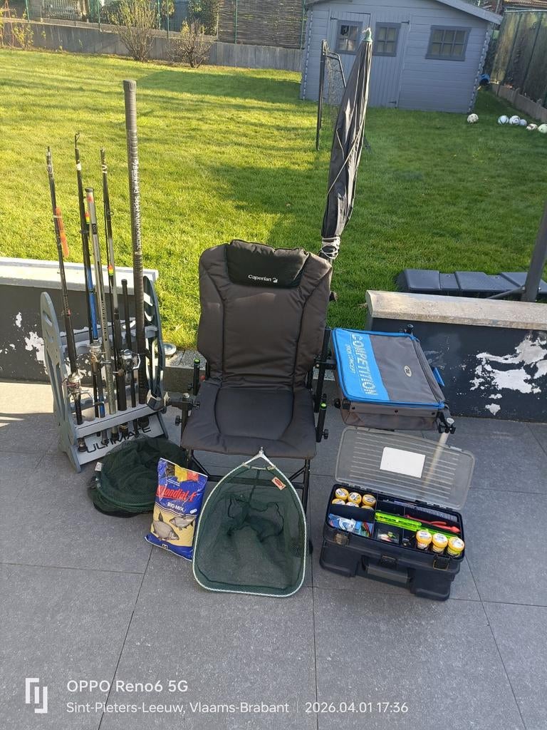 GisterenTopadvertentievidaXLHeel België - Klein visterreinVisstoel met accessoires 3 werphengels met molens vaste stok 9,30m met elastiek telescopisch landingsnet leefnet vissersparaplu bak met klein materiaal voeder ultimate display niet te koop alleen afhaOphalen