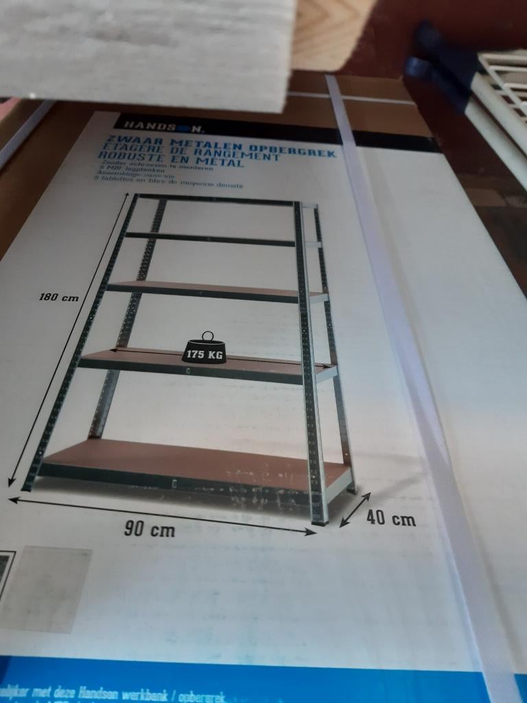5 apr 26JoeriHerenthout - Metalen opbergrekMetalen stelling met houten planken. Goed voor een 2tal rekken denk ik te bouwen zoals op de foto. Er zitten 10 legplanken bij. Afhankelijk hoe groot je ze maakt te gebruiken denk ik. Het is een lichtOphalen