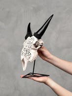28 dec 24BDGeraardsbergen - Geen reserveprijs - Authentieke zwarte handgesneden geitenEen in indonesië met de hand gegraveerde geiten-schedel uit bot, voorzien van een flower of life-motief. Handgesneden gewei van een geit, gegraveerd door vaklieden die de oude gravurekunst van vader o