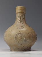 - Bartmann kruik - Steengoed - FrechenEen steengoed baardmankruik uit frechen, duitsland, uit circa 1550–1600, met een vlakke buik en renaissance-portretmedaillons, 14,5 cm breed en 18,5 cm hoog, hals en greep gerestaureerd; in goede staa