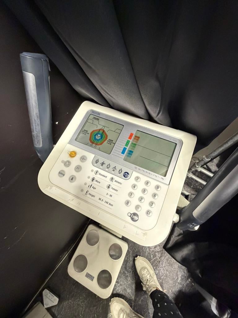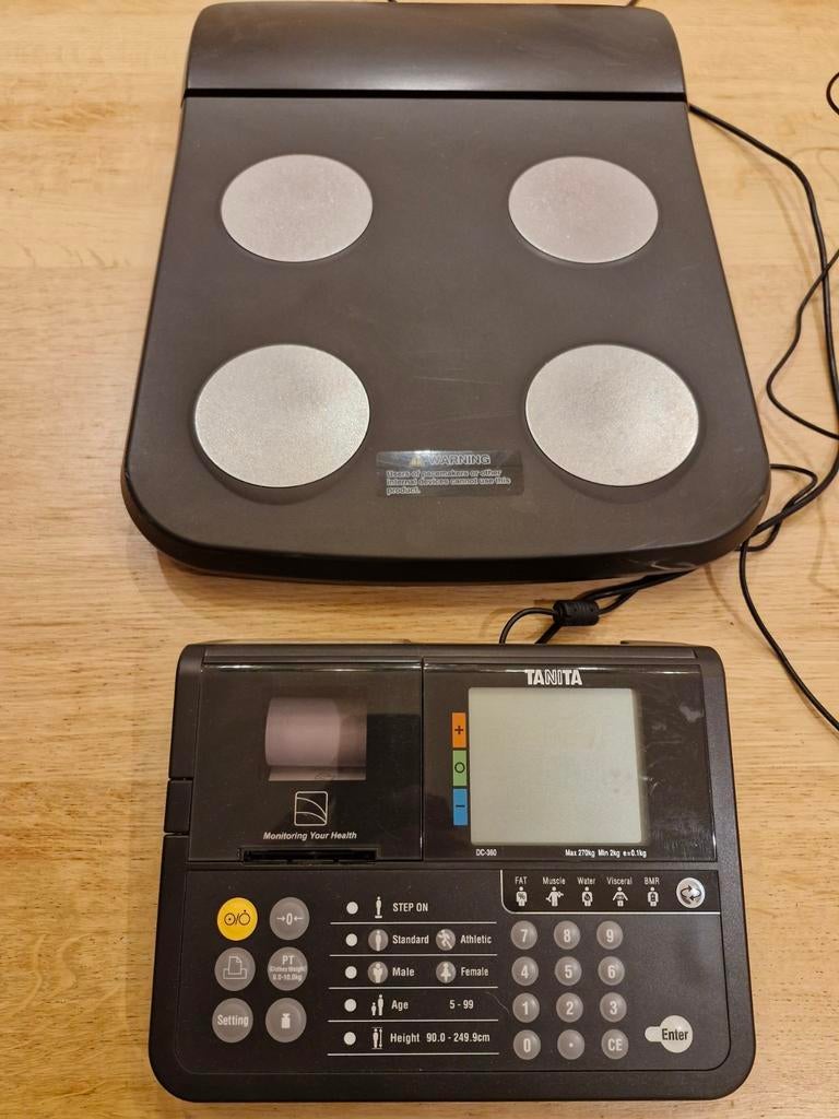 VandaagjetsetSchaerbeek - Tanita Body Analyser DC360Tanita body analyser in zeer goede staat. Enkel kabelaansluiting achteraan weegschaal hangt wat uit de houder. Met ingebouwde bonprinter.ik verkoop dit omdat die overbodig geworden is. Kan op factuur,Ophalen