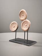 31 mrt 26ArciHasselt - Sunga-dynastie Terracotta Drie Shunga-votieve medailles -Trio shunga-votieve medaillons, 2e–1e eeuw v.chr., In terracotta, elke medaillon ø 5,0 cm en dikte 1,5 cm, totaal gewicht 89,6 g, geplaatst op een speciale metalen standaard uit een privécollectie uit