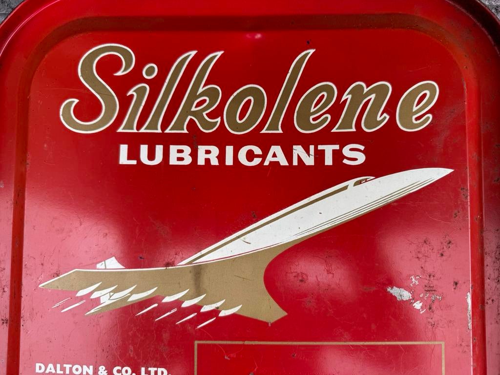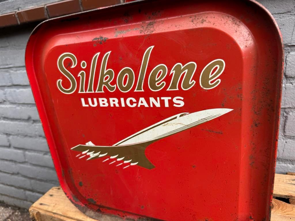 - Silkolene groot oud olieblik / jerrycanEen vintage blikken doos van silkolene smeermiddelen. De doos is rood met een wit en goudkleurig logo van silkolene. Het is een decoratief item voor verzamelaars van vintage reclame of liefhebbers vanGebruikt Ophalen of Verzenden