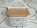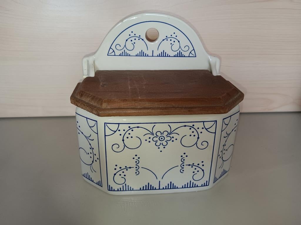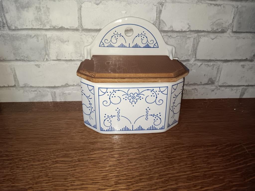 27 feb 26Julie DerwaGistel+Deel Westkerke - Zoutvat Boch Keramis Copenhague met houten dekselGroot zoutvat geproduceerd in la louvière door boch keramis. Dessin is copenhague. Keramiek in perfecte staat. Enkel wat gebruikssporen op het deksel en aan de onderzijde. (Voor details, zie foto’s).Ophalen of Verzenden