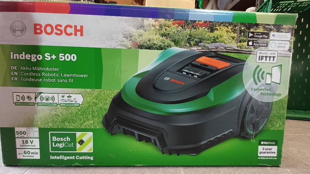 - Bosch Indego S+ 500 robotmaaier, 1 jaar oud, deels nieuwBosch indego s+ 500 robotmaaier voor gazon tot 500 m². Robot is 1 jaar oud (nieuwe ontvangen via garantie). Alle toebehoren zijn nieuw in de originele doos (laadstation, laadkabel, begrenzingsdraad, gZo goed als nieuw Ophalen