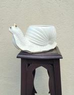 27 jul 23WalterLubbeek - Bassano - Jardinière - Céramique - Cache Pot SnailCache-pot en céramique blanc de bassano, forme d’escargot, italie, période estimée 1990–2000, dimensions 25 × 13 × 12 cm, décor doré minimal, en bon état.