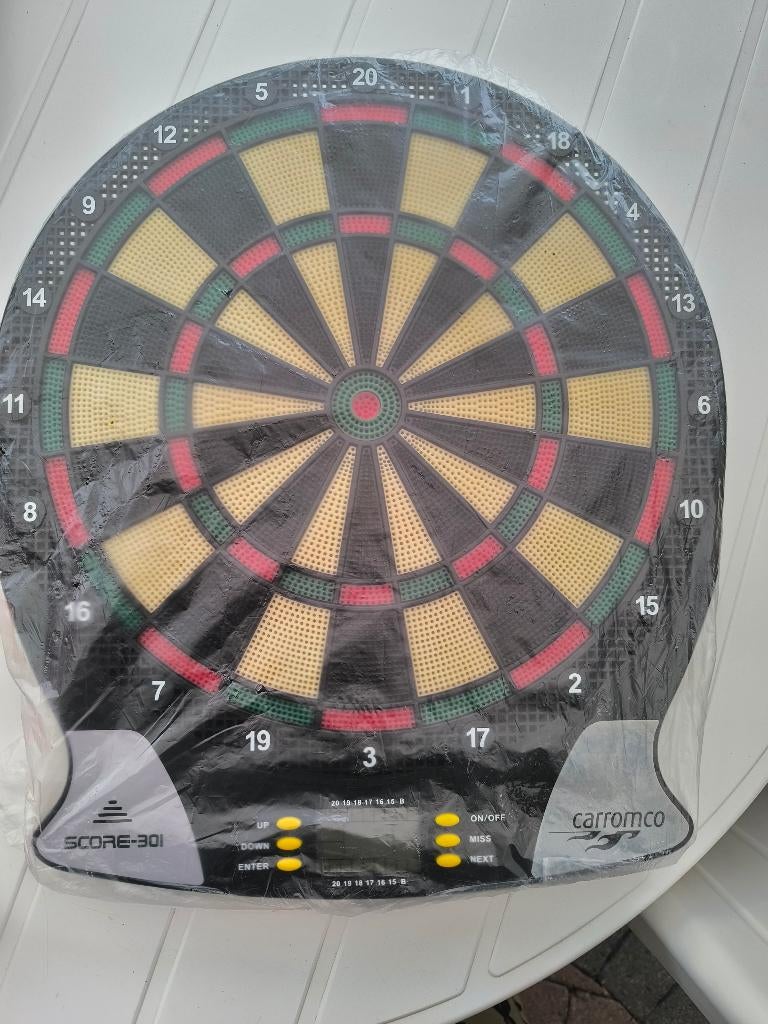 GisterenEricOverijse - Dartbord Elektronisch CarromcoElektronisch dartbord - score 301 - lcd display - 1-8 spelers - 26 spelsoorten - 523 variaties - 4-gaats triples en dubbels - werkt op 3 aa batterijen, niet bijgeleverd - soundeffecten (uitschakelbaarZo goed als nieuw Ophalen of Verzenden