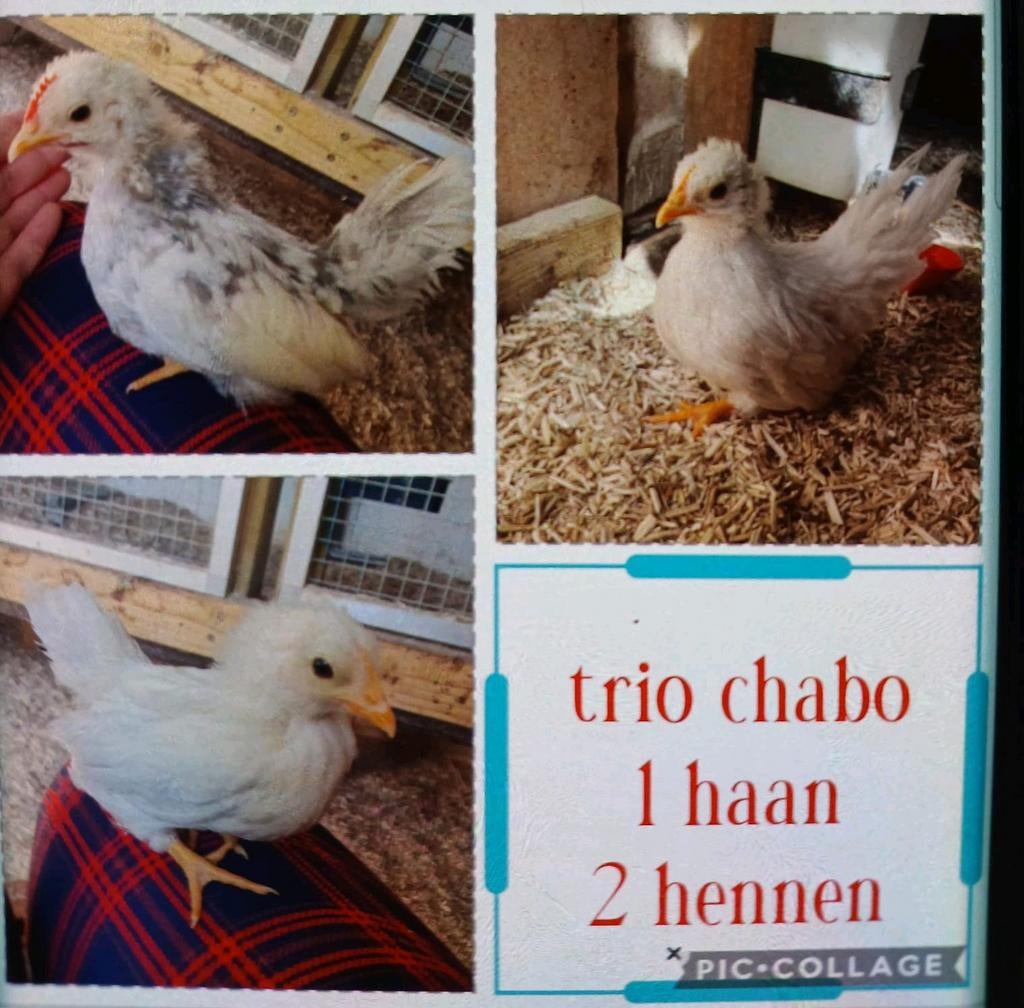 - trio chabo kippenMooi trio 1 han grijs wit 2 hennen met iets licht grijs tussen de 6 ( haan en 1 hen) en 8 (1 hen) weken oud. Moeten nkg wven binnen blijven.. Kunnen met mooi zonnig weer wel buiten.