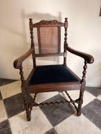 9 apr 26TopadvertentieCatawikiHeel België - Chaise - Bois, Velours, CanneChaise à bras ancienne imposante datant de 1850–1900, en bois massif avec éléments tournés et fin travail de marqueterie, haute dossier avec panneau rond en rotin central et fronton sculpté, accoudoir