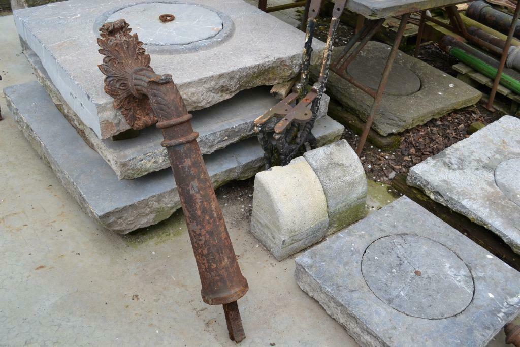 - unieke grote gietijzeren schampijzer, chasse rouePrachtige grote antieke gietijzeren chasse roue uniek stuk bouwantiek, afkomstig van parijs deze is 85 hoog en zit ca 40 uit de muur, diam voet is 15 weegt ca 50a 60kgGebruikt Ophalen