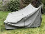 7 dec 25JKKMortsel - CVRT Tent Army Leger Bivak LegervoertuigenTent in goede algemene staat. 1 Rits wat beschadigd. 150Cm op het hoogste punt, 51cm op het laagste punt. Grondoppervlakte: 250cm x 220cm 3 staven voor de laagste kant en draagzak meegeleverd. Hoge stOphalen