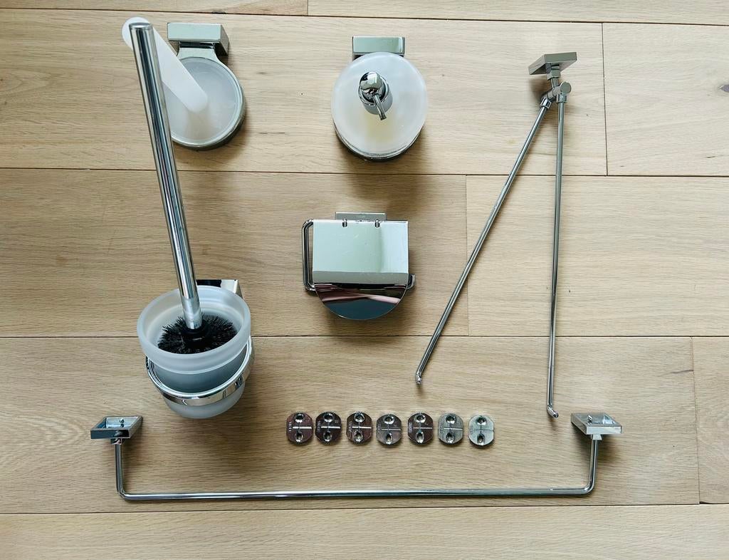 - Set accessoires voor toilet en badkamerSet accessoires voor toilet en badkamer: toiletrolhouder penseelhouder houder voor vloeibare zeep papierdispenser afneembare handdoekhouder met twee takken vaste handdoekhouderZo goed als nieuw