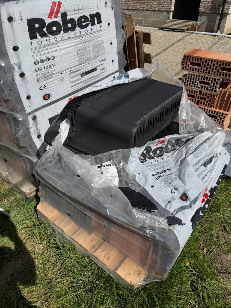 25 jan 26Frank BogaertsVerrebroek - Röben Piemont antraciet matDakpannen 36 m² hoekpan links 10 stuks hoekpan rechts 4 stuks vorsten 4 stuks noordboom 2 stuksNieuw Ophalen