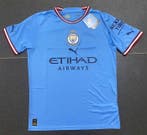 10 feb 26PeterTilburg, NL - Manchester City - Premier League // FA Cup // ChampionsGeluidsloze edition van manchester city 2022/23 treble winners herdenkingsshirt, met het clublogo geborduurd op de borst, gouden borduursels rondom het embleem en een treble kings detail, verpakt in eNieuw