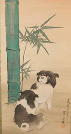 - Hangende rol met puppys - Zijde, hout, bot - Signed - JapanJapanse hangende kakejiku getiteld hanging scroll of puppies, uit 1982 in de shôwaperiode, met inkt, waterverf en gouache op zijde en twee zwart-witte puppy’s naast een bamboestengel onder een rode zo