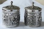23 okt 25IbexHerzele - Douwe Egberts - Herman Hooijkaas Schoonhoven - Theekistje /Twee verzilverde theebusjes met oud hollands tafereel in reliëf, ca. 1970, Hoogte 11 cm, diameter 8 cm, gemaakt door douwe egberts in nederland, in uitstekende staat. Twee theebusjes met oud hollands