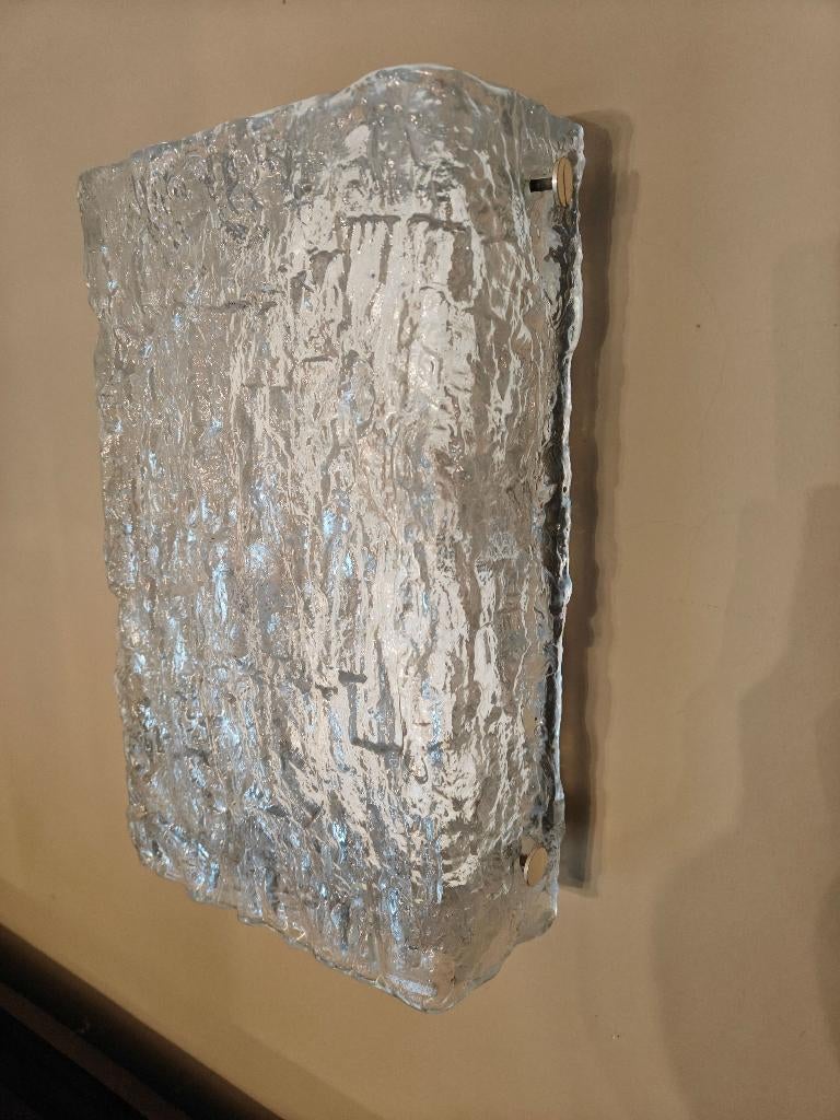 24 dec 23sunnysideupLeuven - Paar vintage Ice glass wandlampen, Kaiser, 1970sTwee wandlampen in dik ijsglas, mat effect, imiteert het reliëf van boomschors. Het glas zorgt voor een mooi diffuus licht en een subtiele sculpturale uitstraling. Dankzij de tijdloze design passen deOphalen