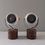 17 dec 24TopadvertentieCatawikiHeel België - Tafellamp (2) - Gelakt metaal, hout - Eyeball, Space-ageTwee tafellampen in spage-age stijl uit de jaren 70/80, elk met een houten basis en een beige gelakte metalen bol bevestigd door een beugel; hoogte 24 cm, diameter houten basis 9 cm, diameter metalen