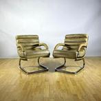 - Fauteuil - Cuir, Acier, Chrome - Paire de fauteuils lounge àPaire de fauteuils lounge cantilever italiens de style space age, cadre en acier chromé et vaste assise rembourrée en cuir synthétique beige, datant de 1960–1970, en bon état avec peu d’usage et de lé