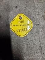 - Vintage fietsplaatje 1981 – Oost-VlaanderenVintage fietsplaatje 1981 – oost-vlaanderen origineel vintage metalen fietsplaatje uit 1981 met opschrift oost-vlaanderen en nummer 152438. In gebruikte staat (zie foto). Heeft lichte roest rond het oOphalen of Verzenden