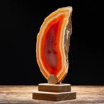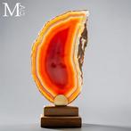 VandaagCyclodeucheNivelles - Flamme Passion Rouge - Agate rouge naturelle extrême rare -échantillon : red passion flame, agate rouge naturelle extrêmement rare, monté sur une base en bois et laiton; poids 459 g; dimensions 240 × 120 × 80 mm; origine: base artisanale italienne, brasile.
