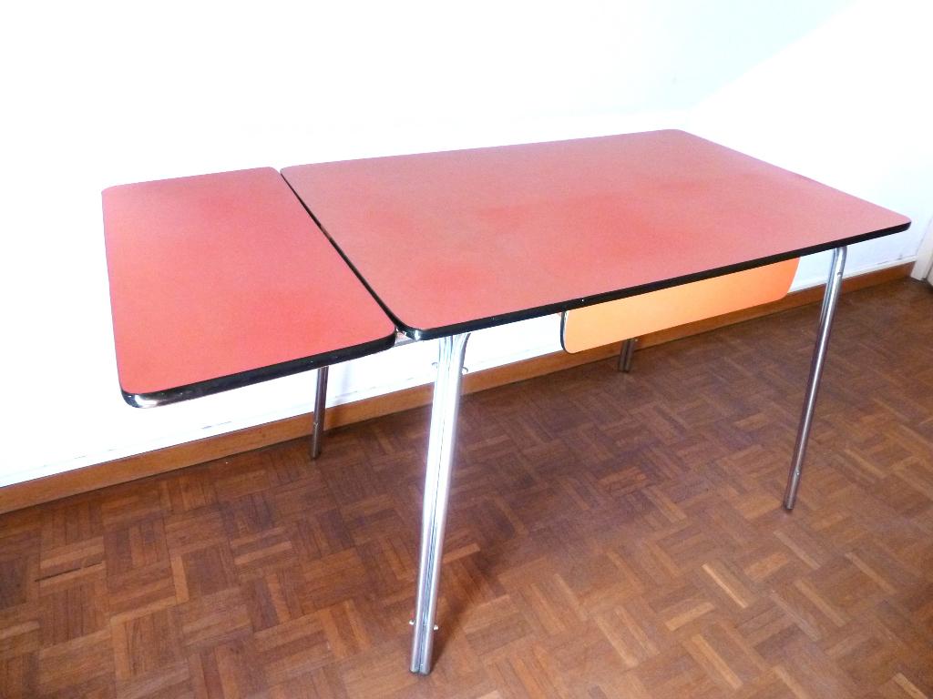 24 mrt 26natpatcheRonse - TORCK rode formicatafel jaren ‘60Vintage jaren ‘60 formicatafel van het merk torck uit deinze rode formica op chroom onderstel, met verlengstuk en lade in goede staat met enige verkleuring afmetingen : 100/130 x 65 x 73 cmGebruikt Ophalen