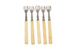 19 jun 19TopadvertentieCatawikiHeel België - Fourchette (5) - Argent 900Ensemble de cinq fourchettes à dessert françaises anciennes en argent 9001 avec des manches en bakélite claire, datées de 1850–1900 et en bon état avec de légers signes d’usure.