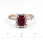 2 feb 26Fien FramboosGent - Ring - 14 karaat Geel goud - 2.12ct. tw. Rhodoliet - DiamantNieuwe 14 kt geelgouden ring met een centrale 1,80 ct smaragdgeslepen roze rhodoliet, omgeven door een halo van 36 natuurlijke ronde diamanten van totaal 0,32 ct (kleur gh, helderheid si tot si3), rin