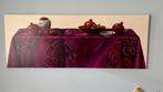 - Sasja Wagenaar (1959) - Fuchsia zijde met granaatappelsSasja wagenaar laat zich in haar monumentale stillevens inspireren door alledaagse kleine objecten die ze in al hun eenvoud, maar tegelijk rijkdom, weergeeft. Zijden doeken, porseleinen kommen, ze str
