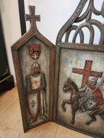 21 jul 25IvoAsse - Antiek Drieluik - Eik - 1960-1970 - Groot MassiefGroot massief eikenhouten drieluik (4kg) – handgestoken kruisvaarders – franck-jozefbeschrijving:uniek en monumentaal houten triptiek (drieluik) van massief eikenhout, volledig met de hand gestoken in